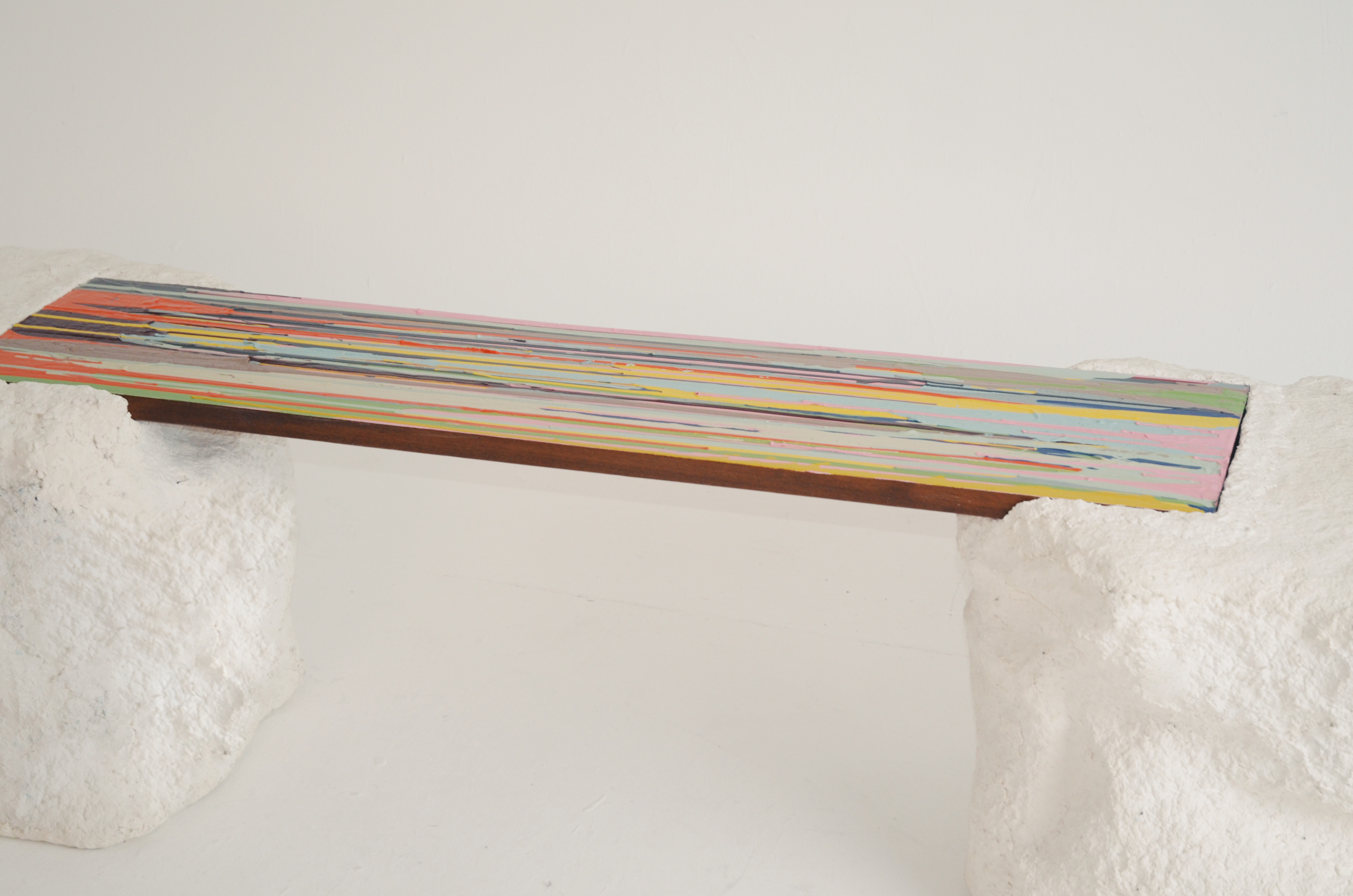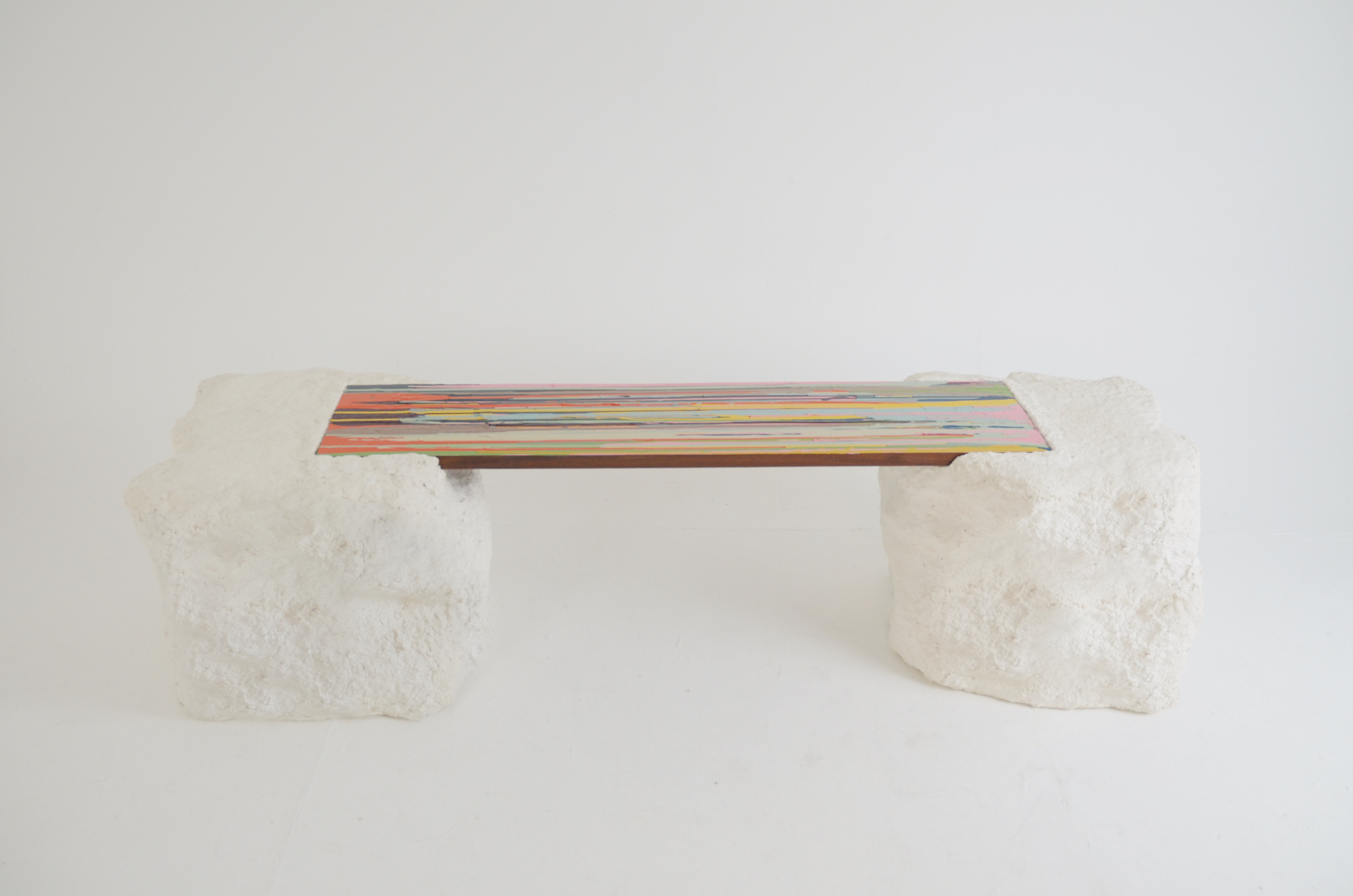 Working together with artist and designer Ella Doran and in sponsorship with G.F. Smith, we created this bench. The bench top is made from Salvaged Iroko Wood, which extends the legacy of Ella’s waste paint from her Paint Drop Project. The stones are made from a variety of different G.F Smith white paper remnants from their factory.