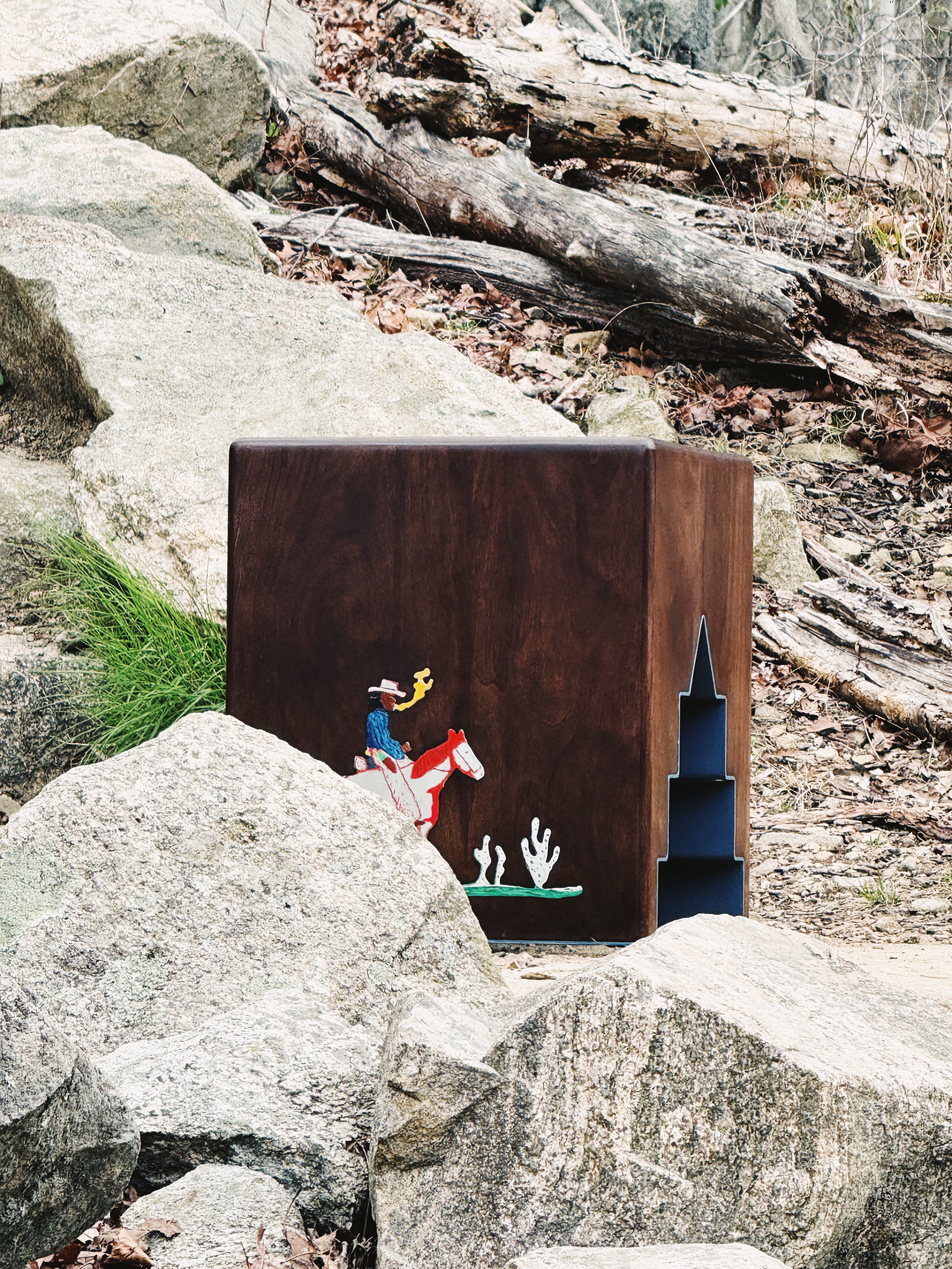 Black Cowboy” is a hand-painted work featuring laser-cut aluminium inlays that honour the legacy of African American cowboys. Often romanticised in Western films and folklore, cowboys are seen as rebellious heroes—figures who lived by their own code and carved their path through the rugged landscape of early 20th-century America. What’s often overlooked, however, is the significant presence of Black cowboys, whose stories were rarely celebrated in the same way. With cowboy and ranch imagery deeply woven into cabin aesthetics, this piece is my way of reimagining that iconic figure—bringing forward a narrative that’s been overshadowed.